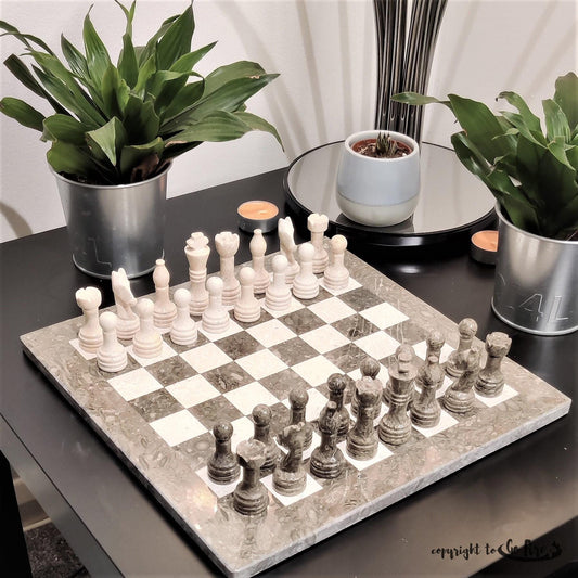 Handmade Marble Chess Set: White and Natural Grey 12x12 inches Chess Board with Black Velvet Case
