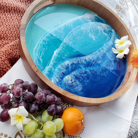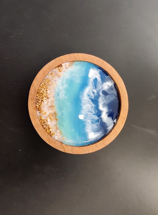 We offer in-house Handmade Ocean resin art in various products like wooden trays, coasters, trinket dishes, and jewelry organizers
