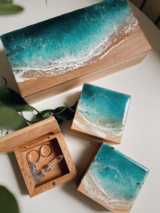 Handmade Ocean Resin Art Wooden Jewelry Box – Personalized Keepsake Box, Custom Travel Jewelry Organizer, Unique Gift for Her